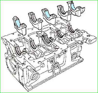 • - Установите вкладыши с канавками в крышки коренных подшипников 2 и 4, а вкладыши без канавок в крышки коренных подшипников 1, 3 и 5.