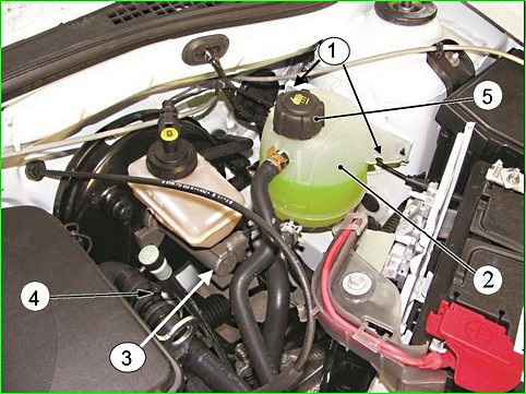 Отвернуть и снять пробку 2 в сборе с датчиком уровня тормозной жидкости.