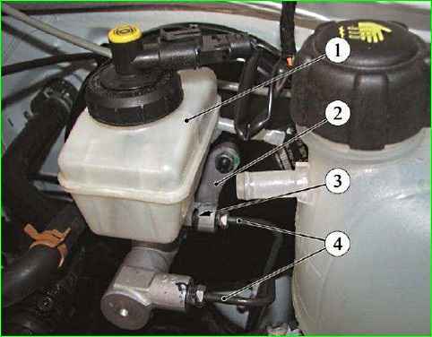 Специальным ключом для тормозных трубок отсоединяем штуцеры тормозных трубок 4 от главного цилиндра 2 тормоза, отводим трубки в сторону и устанавливаем в отверстия главного цилиндра и на тормозные трубки технологические заглушки (можно заглушки от штуцеров прокачки тормозов).