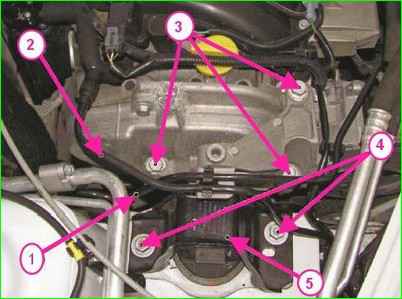Снятие правой опоры подвески двигателя К4М: 1 - трубка топливная; 2 - трубка системы улавливания паров топлива; 3 - болт крепления кронштейна правой опоры подвески к двигателю; 4 - болт крепления правой опоры подвески двигателя к кузову; 5 - правая опора подвески двигателя