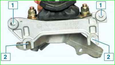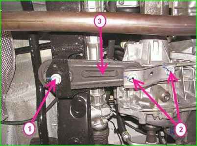 Снятие задней опоры подвески двигателя: 1 - болт крепления задней опоры подвески двигателя к подрамнику передней подвески; 2 - болт крепления задней опоры подвески двигателя к коробке передач; 3 - задняя опора подвески двигателя