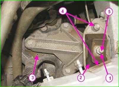Отсоединение коробки передач от левой опоры подвески двигателя: 1 - гайка шпильки крепления коробки передач; 2 - подушка левой опоры подвески двигателя; 3 - коробка передач; 4 - гайка крепления подушки левой опоры подвески двигателя; 5 - шпилька крепления коробки передач