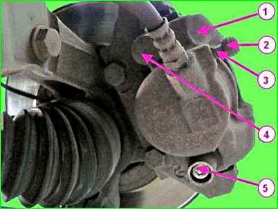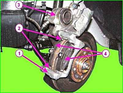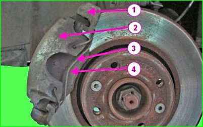 Поворачиваем суппорт 3, рисунок 2, вверх и извлекаем тормозные колодки 4 и шумоподавляющие пластины 2.