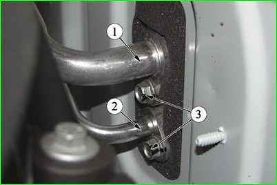 Ключом на 13 откручиваем болты 3, рисунок 1, крепления и отсоединяем трубку 1, соединяющую компрессор с испарителем (короткая часть) и трубку 2, соединяющую конденсатор с испарителем, от блока испарителя.