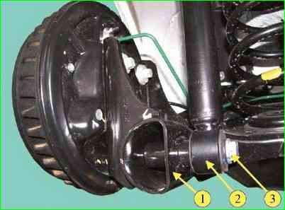 Снимаем заглушки 1, рисунок 1, мест крепления амортизаторов к аркам задних колес. Снимаем задние колеса.
