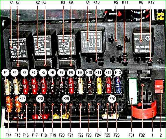 Расположение реле и предохранителей в монтажном блоке: 1, 2 - пинцеты; К1 - реле включения электровентилятора радиатора системы охлаждения двигателя; К2 - реле включения обогрева заднего стекла; К3 - реле включения стартера; К4 - дополнительное реле (реле зажигания); К5 - место для резервного реле; К6 - реле включения омывателя и очистителя ветрового стекла; К7 - реле включения дальнего света фар; К8 - реле включения звукового сигнала; К9 - реле включения тревожного сигнала; К10, К11, К12 - места для резервного реле; F1-F32 - плавкие предохранители