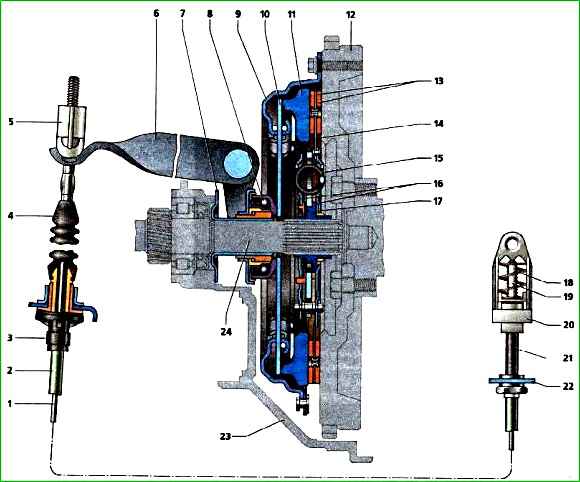 Сцепление и его привод: 1 - трос привода сцепления; 2 - оболочка троса; 3 - нижний наконечник оболочки троса; 4 - защитный чехол; 5 - поводок; 6 - рычаг вилки; 7 - направляющая втулка подшипника; 8 - подшипник выключения сцепления; 9 - кожух сцепления; 10 - нажимная пружина; 11 - нажимной (ведущий) диск сцепления; 12 - маховик; 13 - фрикционные накладки ведомого диск; 14 - ведомый диск; 15 - пружина демпфера; 16 - демпфер крутильных колебаний; 17 - ступица ведомого диска; 18 - пружина; 19 - зубчатый наконечник троса; 20 - корпус механизма автоматической регулировки длины троса; 21 - распорная втулка; 22 - кронштейн оболочки троса; 23 - картер сцепления; 24 - первичный вал коробки передач