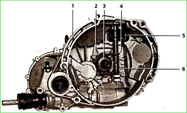 Элементы механизма привода сцепления: 1 - картер сцепления; 2 - направляющая втулка подшипника выключения сцепления; 3 - подшипник выключения сцепления с кожухом в сборе; 4 - вилка выключения сцепления; 5 - грязезащитный чехол; 6 - пружинная скоба подшипника