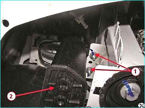 Снятие адсорбера: 1 – гайки крепления адсорбера; 2 – адсорбер