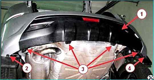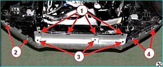 Нижнее крепление бампера: 1 – винт крепления бампера к подрамнику; 2 – винт нижнего крепления бампера к кузову; 3, 4 – винт крепления щитка грязезащитного арки колеса к бамперу;