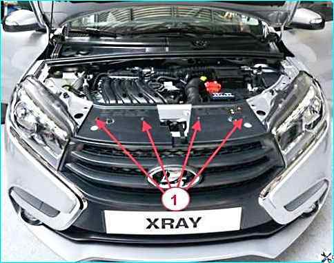 Головкой Torx T30 отворачиваем четыре винта 1 , рисунок 1, крепления бампера к подрамнику.