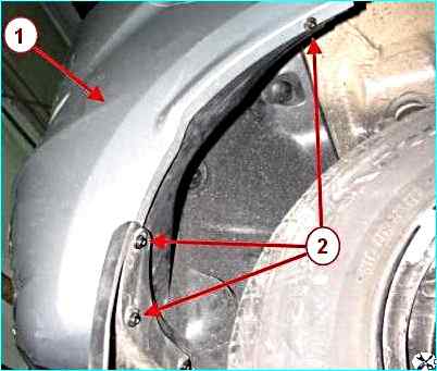 Головкой Torx T20 откручиваем с правой и левой стороны по три винта самонарезающих 2, рисунок 5, бокового крепления бампера 1 и брызговика.