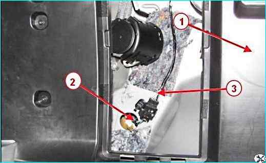 Отсоединяем колодку жгута проводов 2, рисунок 6, бампера от колодки заднего жгута проводов 3, доступ к соединению обеспечивается при снятой вентиляционной решетке в левой обивке 1 боковины.