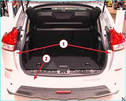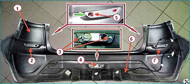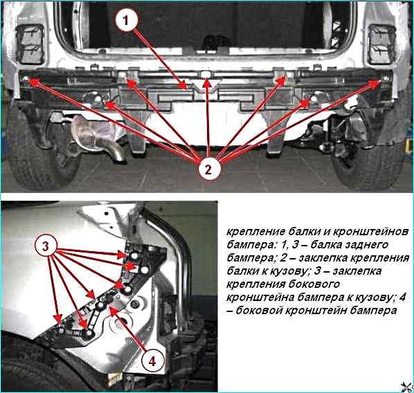 Балка заднего бампера 1, рисунок 9 и боковые 4 кронштейны бампера, изготовлены из пластмассы и крепятся к кузову с помощью заклепок.