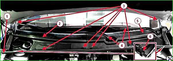 рис. 1. Крепление накладки рамы ветрового окна: 1 - уплотнитель капота; 2 - накладка рамы ветрового окна правая; 3 - винт крепления накладки рамы ветрового окна; 4 - рычаг стеклоочистителя; 5 - накладка рамы ветрового окна левая; 6 - клипса
