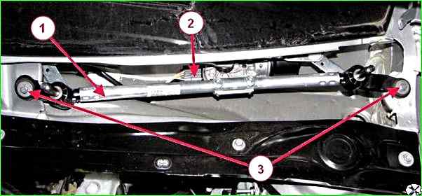 рис. 2. Крепление стеклоочистителя: 1 - стеклоочиститель; 2 - колодка жгута проводов; 3 - болт крепления стеклоочистителя