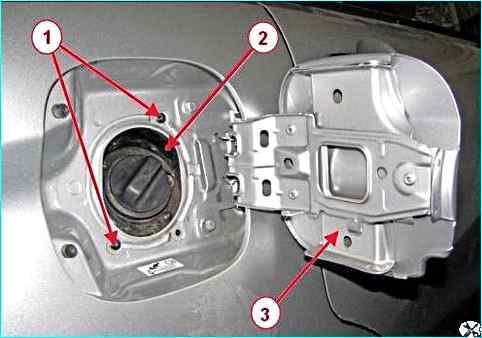 Крепление наливной горловины топливного бака: 1 – винт самонарезающий; 2 – наливная горловина топливного бака; 3 – люк наливной горловины топливного бака