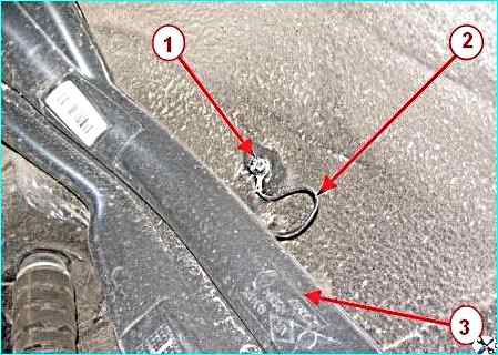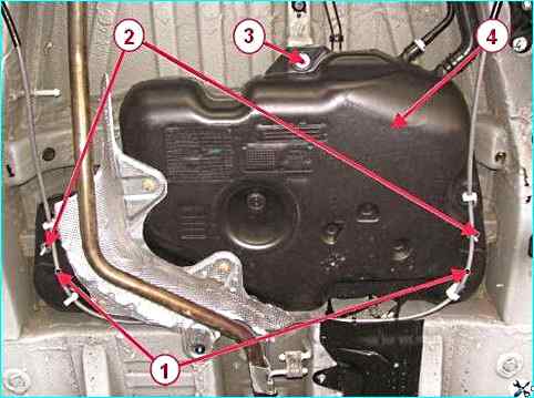 Отворачиваем две гайки 2 и два болта 3 крепления топливного бака.