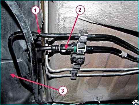 Присоединить трубки 1 и 2, рисунок 5, к трубкам топливного бака 3 движением вдоль оси штуцера до щелчка пружинного фиксатора соединителя. Проверить надежность фиксации трубок.