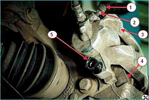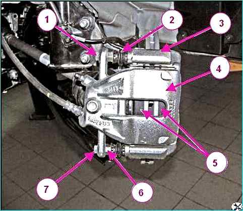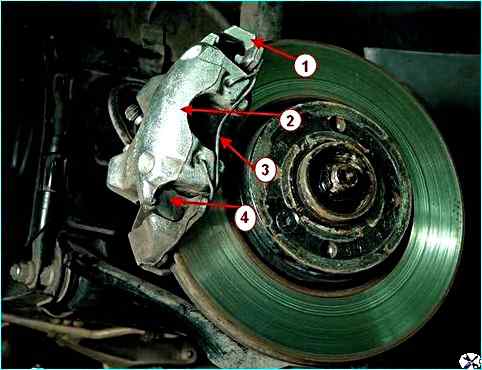 Поворачиваем суппорт 1, рисунок 9, переднего тормоза вверх и извлекаем тормозные колодки 2 и шумоподавляющие пластины 4.