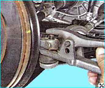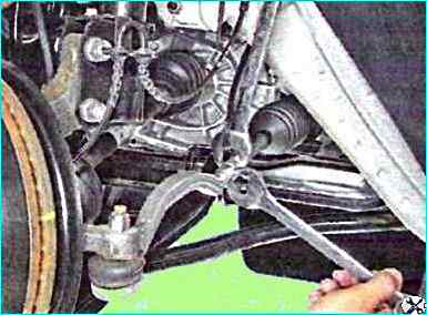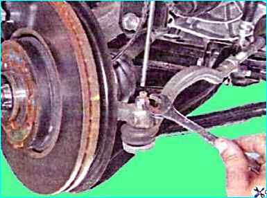 Полностью отвернув гайку крепления пальца, выводим палец шарового шарнира из отверстия в рычаге.