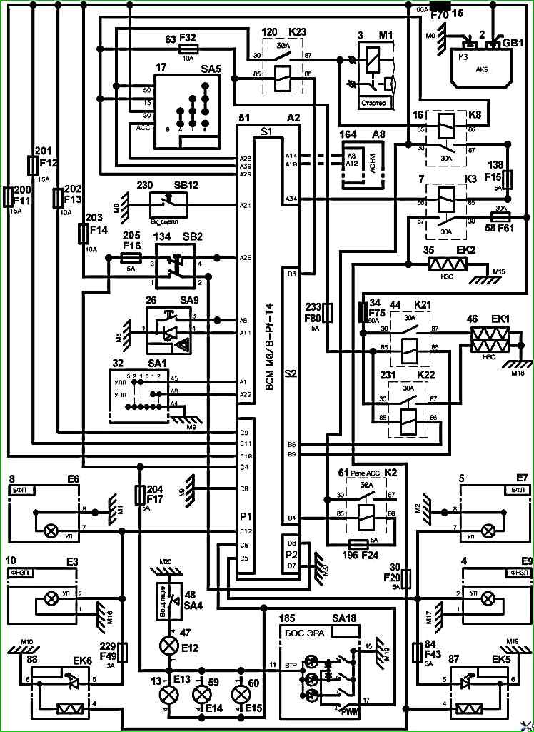 Схема электрических соединений ЦБКЭ: 2 – батарея аккумуляторная; 3 – стартер; 4 – фонарь задний внешний левый; 5 – блок-фара левая; 7 – реле обогрева заднего стекла (К3); 8 – блок-фара правая; 10 – фонарь задний внешний правый; 13 – плафон освещения багажника; 15 – предохранитель 60 А (F70); 16 – реле дополнительное (К8); 17 – выключатель зажигания; 26 – выключатель аварийной сигнализации; 30 – предохранитель 5 А (F20); 32 – переключатель подрулевой левый (переключатель световой сигнализации); 34 – предохранитель 60 А (F75); 35 – обогреватель заднего стекла; 44 – реле обогрева ветрового стекла 1 (К21); 46 – обогреватель ветрового стекла; 47 – плафон освещения вещевого ящика; 48 – выключатель плафона освещения вещевого ящика; 51 – ЦБКЭ (контроллер ВСМ); 58 – предохранитель 30 А (F61); 59 – плафон освещения порога левый (устанавливается на комплектации "люкс"); 60 – плафон освещения порога правый (устанавливается на комплектации "люкс"); 61 – реле дополнительных потребителей (К2); 63 – предохранитель 10 А (F32); 84 – предохранитель 3 А (F43); 87 – зеркало наружное левое; 88 – зеркало наружное правое; 120 – дополнительное реле стартера (К23); 134 – выключатель сигнала торможения; 138 – предохранитель 5 А (F15); 164 – панель управления кондиционером (схема подключения для комплектации "комфорт"); 185 – блок освещения салона с интерфейсным модулем ЭРА-ГЛОНАСС; 196 – предохранитель 5 А (F24); 200 – предохранитель 15 А (F11); 201 – предохранитель 15 А (F12); 202 – предохранитель 10 А (F13); 203 – предохранитель 10 А (F14); 204 – предохранитель 5 А (F17); 205 – предохранитель 5 А (F16); 229 – предохранитель 3 А (F49); 230 – выключатель сигнала положения педали сцепления; 231 – реле обогрева ветрового стекла 2 (К22); 233 – предохранитель 5 А (F80)