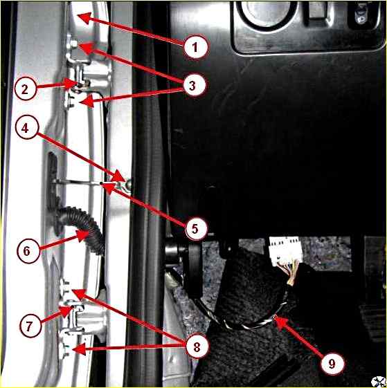 Отсоединяем колодку жгута 9, рисунок 1, проводов двери 1 от колодки жгута проводов панели приборов.