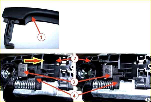 Для снятия ручки 10 наружной замка двери, нужно взяться за ручку и, не оттягивая ее сдвинуть назад, затем в сдвинутом положении потянуть заднюю часть ручки до выхода заднего зацепа из отверстия в панели двери и потянув за ручку с усилием, преодолевающим усилие шарнирного фиксатора передней части ручки снять ручку.