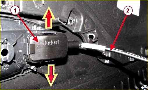 Плоской отверткой разжимаем фиксаторы наконечника 1, рисунок 3, обоймы, троса 2 внутренней ручки привода замка, отсоединяем трос от ручки.