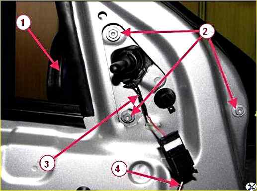 Крепление наружного зеркала: 1 – зеркало наружное; 2 – винты крепления зеркала; 3 – жгут проводов зеркала; 4 – жгут проводов двери