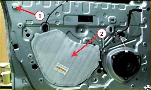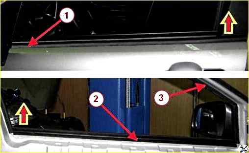 Беремся за край наружного 1, рисунок 5, горизонтального уплотнителя опускного стекла и, потянув вверх, снимаем уплотнитель с панели двери.