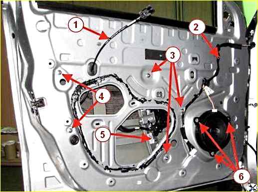Арматура двери: 1 – трос внутренней ручки привода замка; 2 – жгут проводов двери; 3 – гайка крепления стеклоподъемника; 4 – гайка крепления направляющей опускного стекла; 5 – стеклоподъемник; 6 – заклепка крепления громкоговорителя