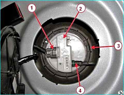 Для этого поднимаем подушку заднего сидения, снимаем крышку лючка электробензонасоса и отсоединяем штекер 1, рисунок 1 от топливного модуля.
