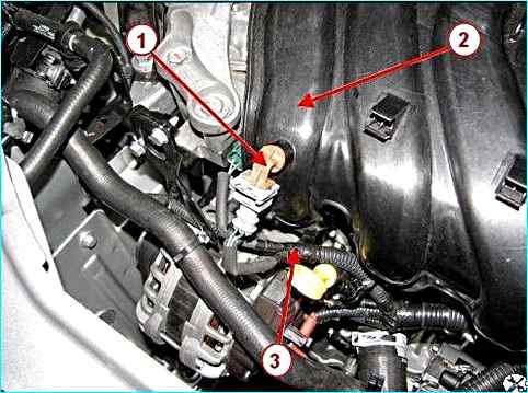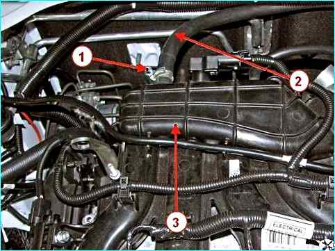 Шланг вакуумного усилителя тормозов на двигателе 21129: 1 – хомут; 2 – шланг вакуумного усилителя тормозов; 3 – модуль впуска