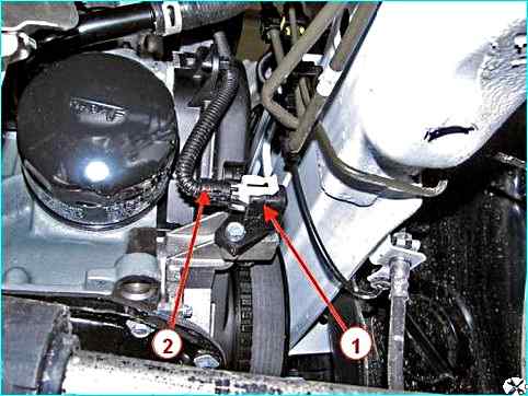 Установка датчика положения коленчатого вала на двигателях 21129 и 21179: 1 – датчик положения коленчатого вала; 2 – жгут проводов двигателя