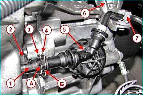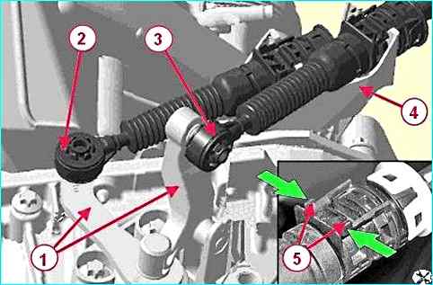 Нажимаем с двух сторон на усики 5 фиксаторов и отсоединяем стопоры оболочек тросов от кронштейна 4 на коробке передач.