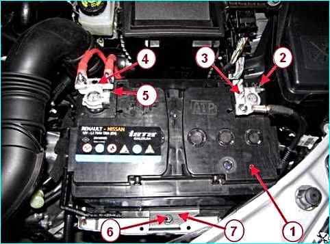 Аккумуляторная батарея (АКБ): 1 – аккумуляторная батарея; 2, 5 – гайка; 3 – клемма провода "массы"; 4 – клемма провода "+"; 6 – болт; 7 – планка прижимная