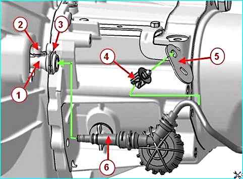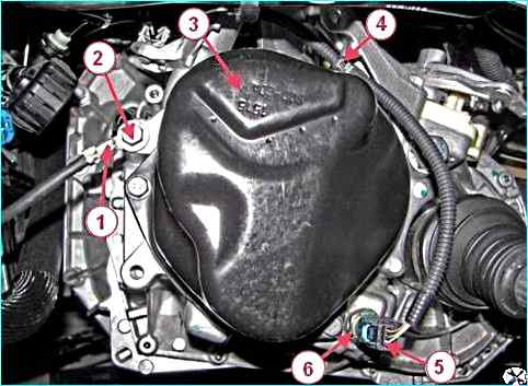 Крепление клеммы жгута провода "массы" и разъема жгута проводов двигателя к МКП: 1 – клемма провода "массы"; 2 – болт; 3 – крышка 5-ой передачи; 4 – скоба крепления жгута проводов; 5 – разъем жгута проводов двигателя к выключателю света заднего хода; 6 – выключатель света заднего хода