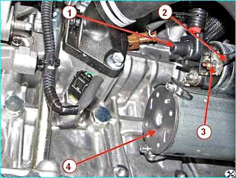 Дроссельный патрубок на двигателе Н4М: 1 – дроссельный патрубок; 2 – жгут проводов двигателя; 3 – кронштейн двигателя; 4 – хомут крепления жгута проводов