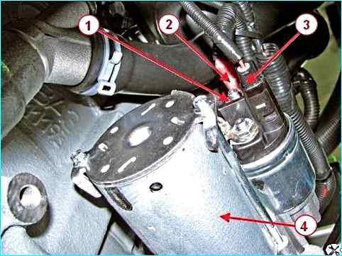 Головкой на 13 отворачиваем гайку 1, рисунок 23, и отсоединяем от тягового реле стартера 4 клемму 2 и разъем 3 жгута проводов двигателя.