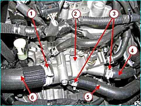 С помощью щипцов разжимаем хомуты 1 и 3, рисунок 26, и отсоединяем от патрубков корпуса 2 выхода охлаждающей жидкости шланги подводящий 4 и отводящий 5 отопителя, подводящий 6 радиатора.
