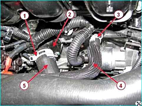 Отсоединяем наконечник 1, рисунок 15, трубки клапана адсорбера и саму трубку от модуля 2 впуска.