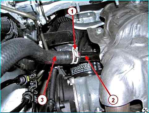 Разжимаем хомут 1, рисунок 29, и отсоединяем от трубы 2 подводящей водяного насоса шланг 3 заправочный.