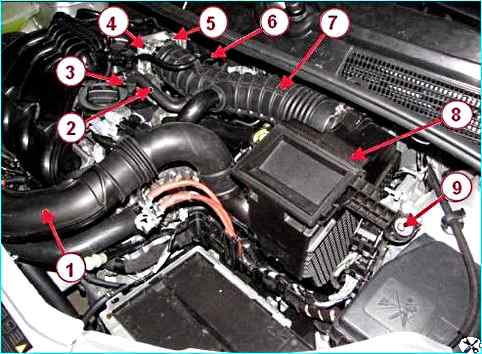 Установить воздушный фильтр 8, рисунок 3, со шлангом 7 впускной трубы в сборе на три опоры крепления и закрепить болтом 9. Момент затяжки болта крепления 7 - 9 Нм (0,7 - 0,9 кгс.м).