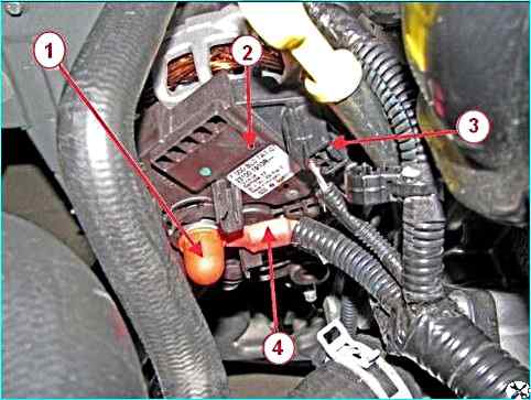 - - головкой на 13 отвернуть гайку крепления и отсоединить от генератора 2 клемму 4 жгута проводов двигателя;