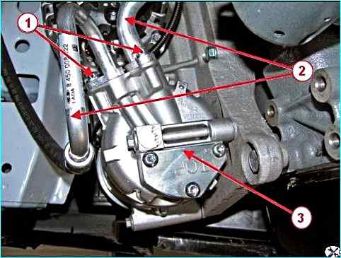 Компрессор системы кондиционирования воздуха: 1 – болт; 2 – трубопроводы системы кондиционирования; 3 – компрессор системы кондиционирования воздуха