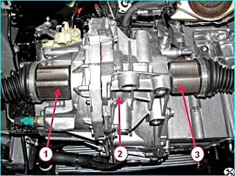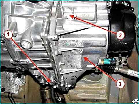 Слив масла из коробки передач: 1 – пробка сливного отверстия; 2 – пробка заливного отверстия; 3 – коробка передач