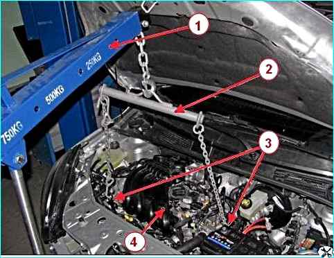 Подставляем гидравлический кран 1, рисунок 38, к автомобилю, заводим крюки грузоподъемного захвата 2 в проушины рымов 3 силового агрегата и вывешиваем силовой агрегат 4.