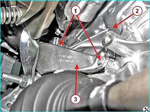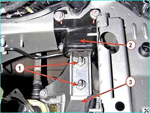 Левая опора подвески силового агрегата: 1 – гайка; 2 – левая опора подвески силового агрегата; 3 – кронштейн левый подвески силового агрегата