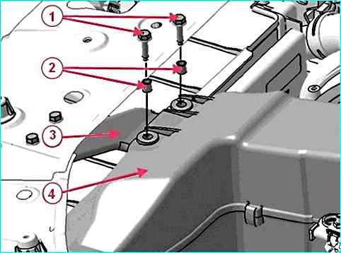 Головкой на 10 откручиваем два болта 1, рисунок 4, крепления резонатора к кронштейну 3 на кузове автомобиля.